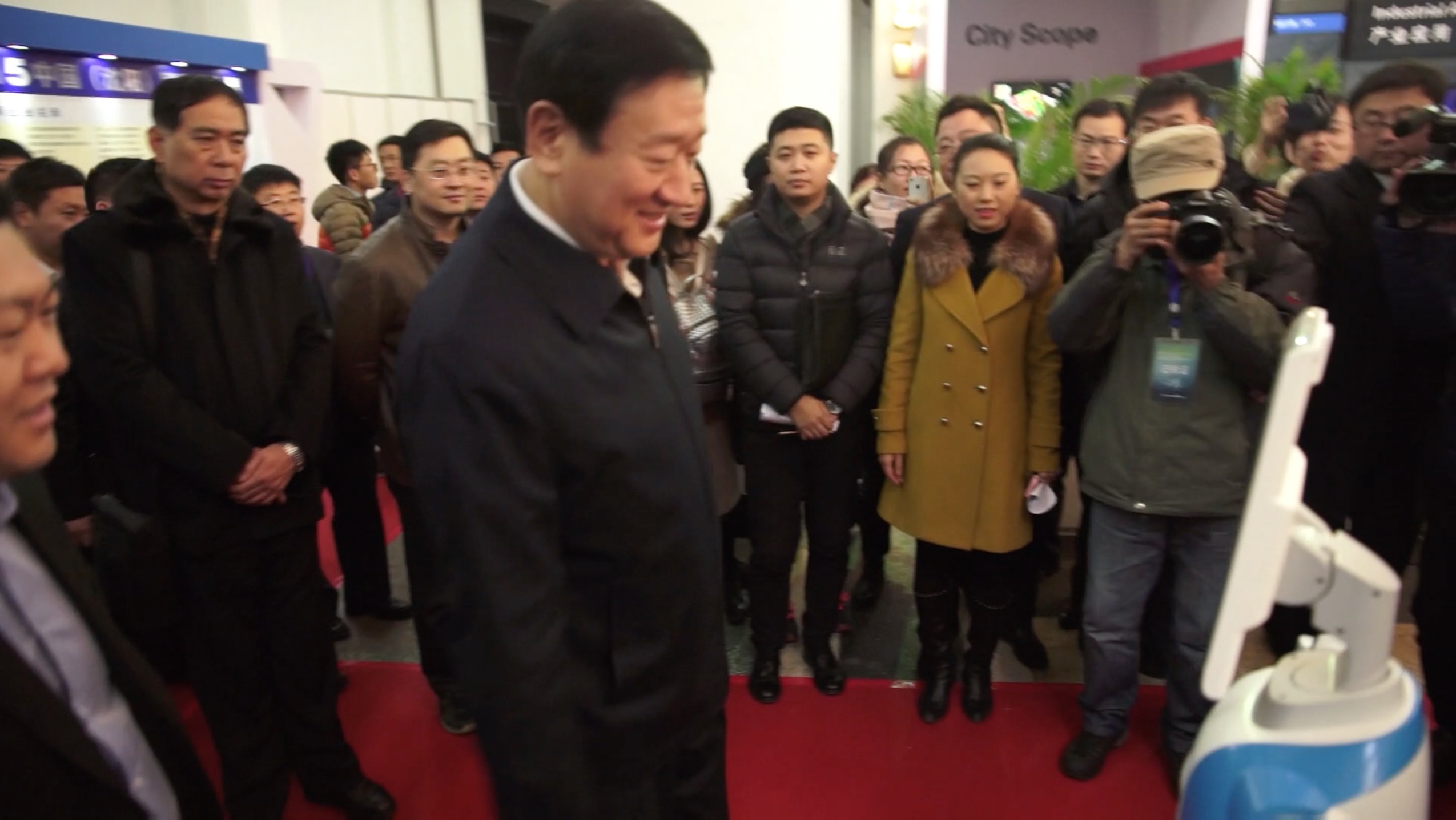 Pan Liguo, mayor of Shenyang, and the intelligent service type "double" robot interaction