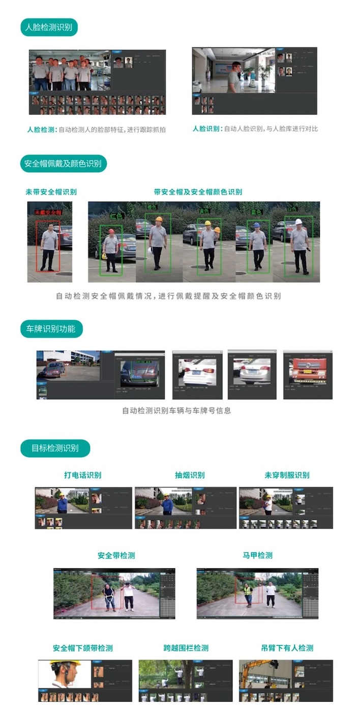 AI algorithms used in electric power operation sites can achieve face detection, face recognition, license plate recognition, helmet wear and helmet color recognition, as well as phone calls, smoking, uniform wear, seatbelt wear, vest wear and other types of target detection and recognition functions.