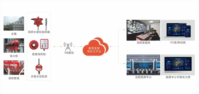 豪恩消防用水監(jiān)測系統(tǒng)采用水管水壓檢測器、消防水液位探測器、蓋帽式智慧消防栓和背帶式智慧消防栓等設(shè)備,實時監(jiān)測消防管網(wǎng)水壓不足、運行故障、非法取水等異常情況,遠程告警,及時維保,確保救火時有水可用。