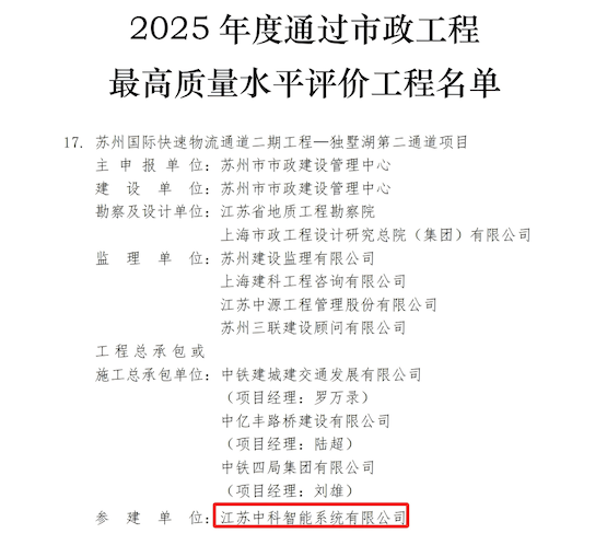 2025年7月22日,中國市政工程協(xié)會公布評選結(jié)果,中安科子公司江蘇中科智能系統(tǒng)有限公司(以下簡稱“中科智能”)參建的蘇州國際快速物流通道二期工程-獨墅湖第二通道項目,榮獲2025年度市政工程最高質(zhì)量水平評價工程。
