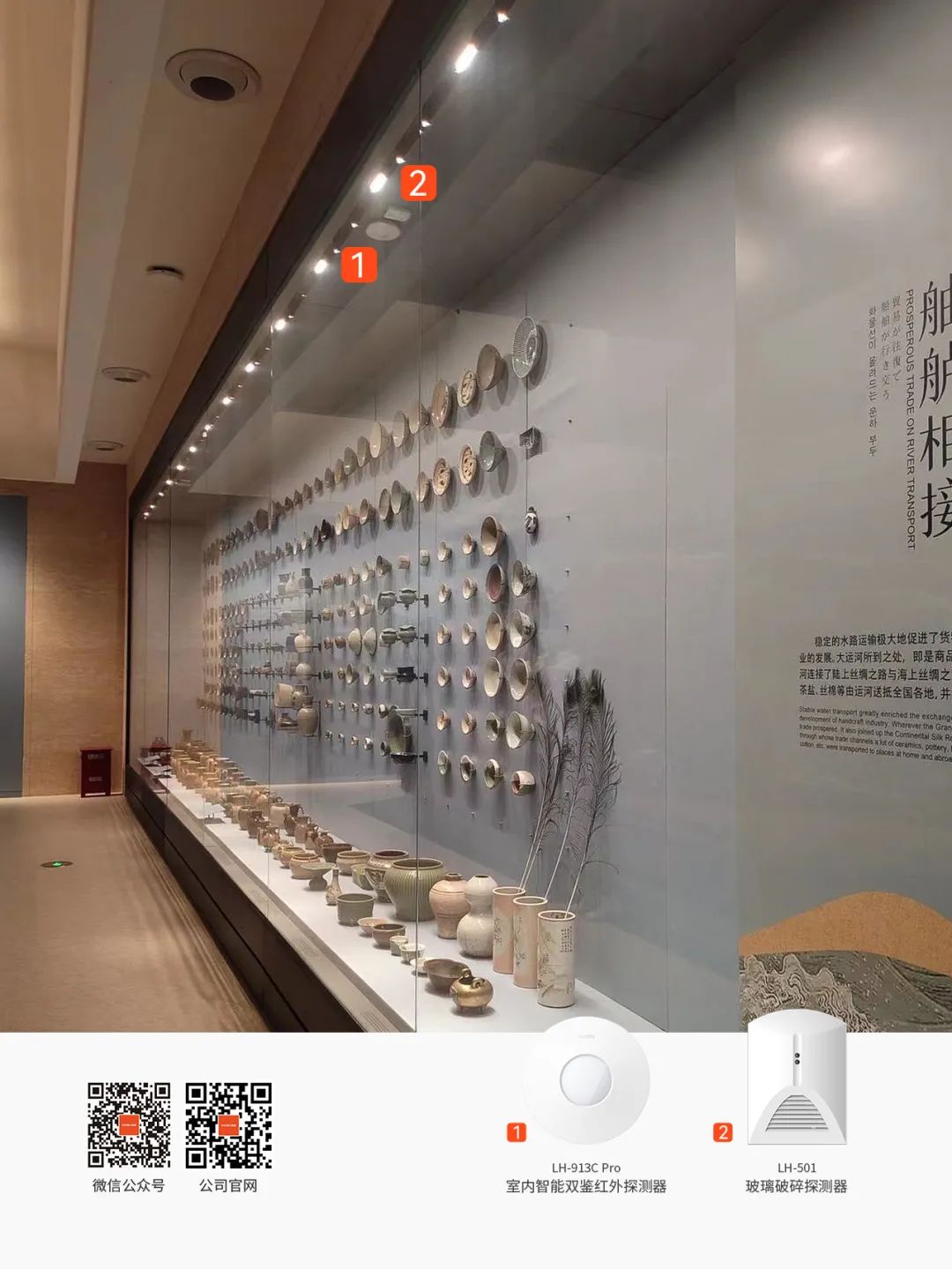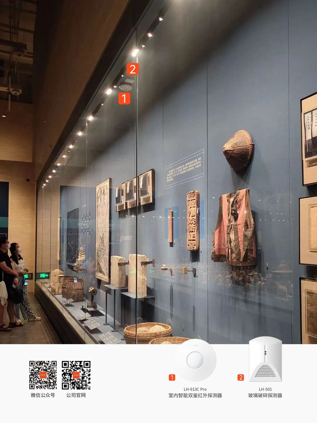 而在每個展柜內(nèi)部,豪恩也安裝了玻璃破碎探測器,及時感知對展柜的惡意敲擊、爆破以及高低溫攻擊等破壞行為,為珍貴的文物筑起第二道保護墻。