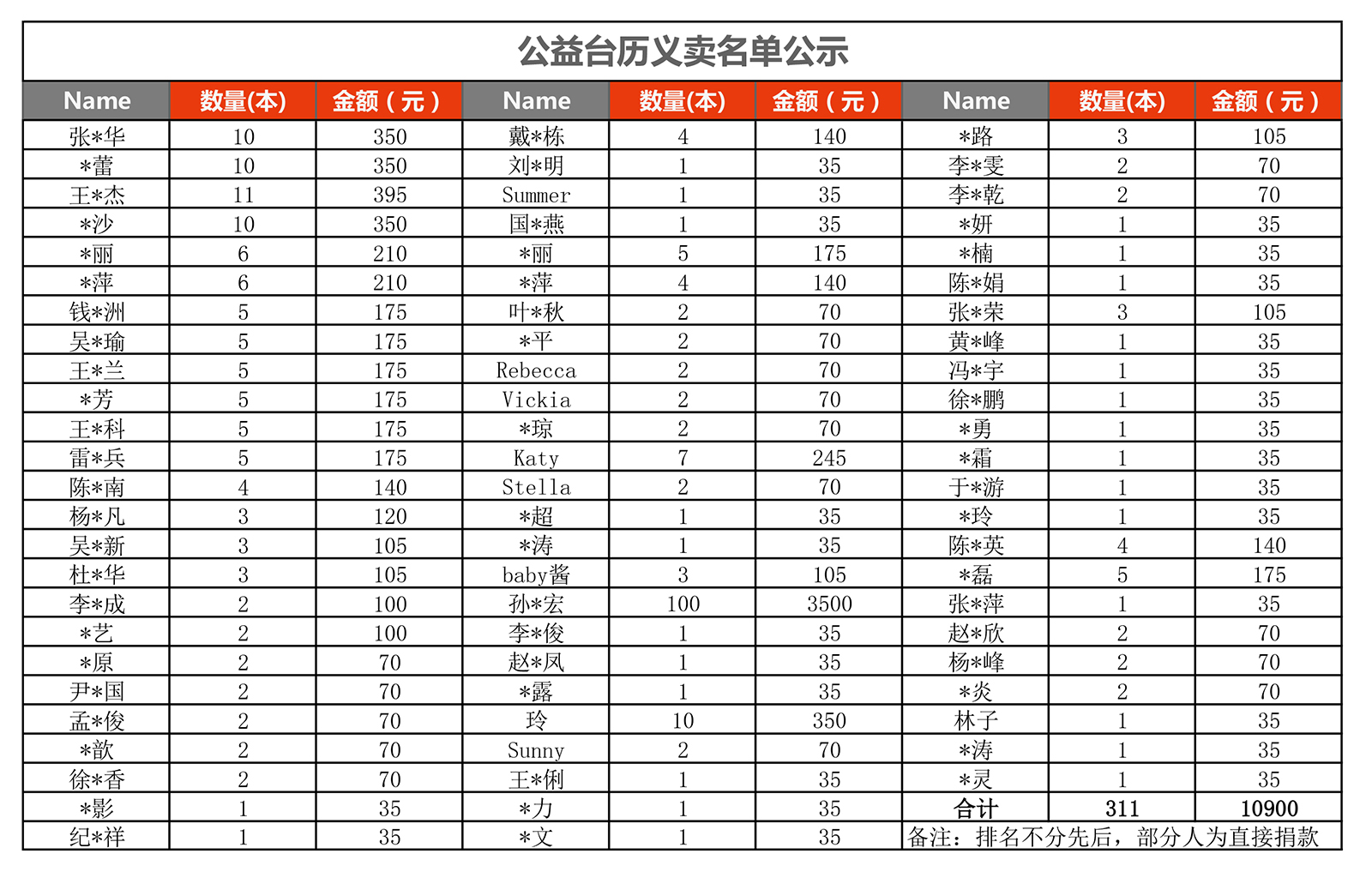 在此,我們衷心感謝感謝所有參與者,您的愛心讓“星星兒童”銘記于心。據(jù)統(tǒng)計,線上線下共有73名愛心人士購買臺歷,認購數(shù)量311本,捐款金額10900元,下表是公示記錄:
