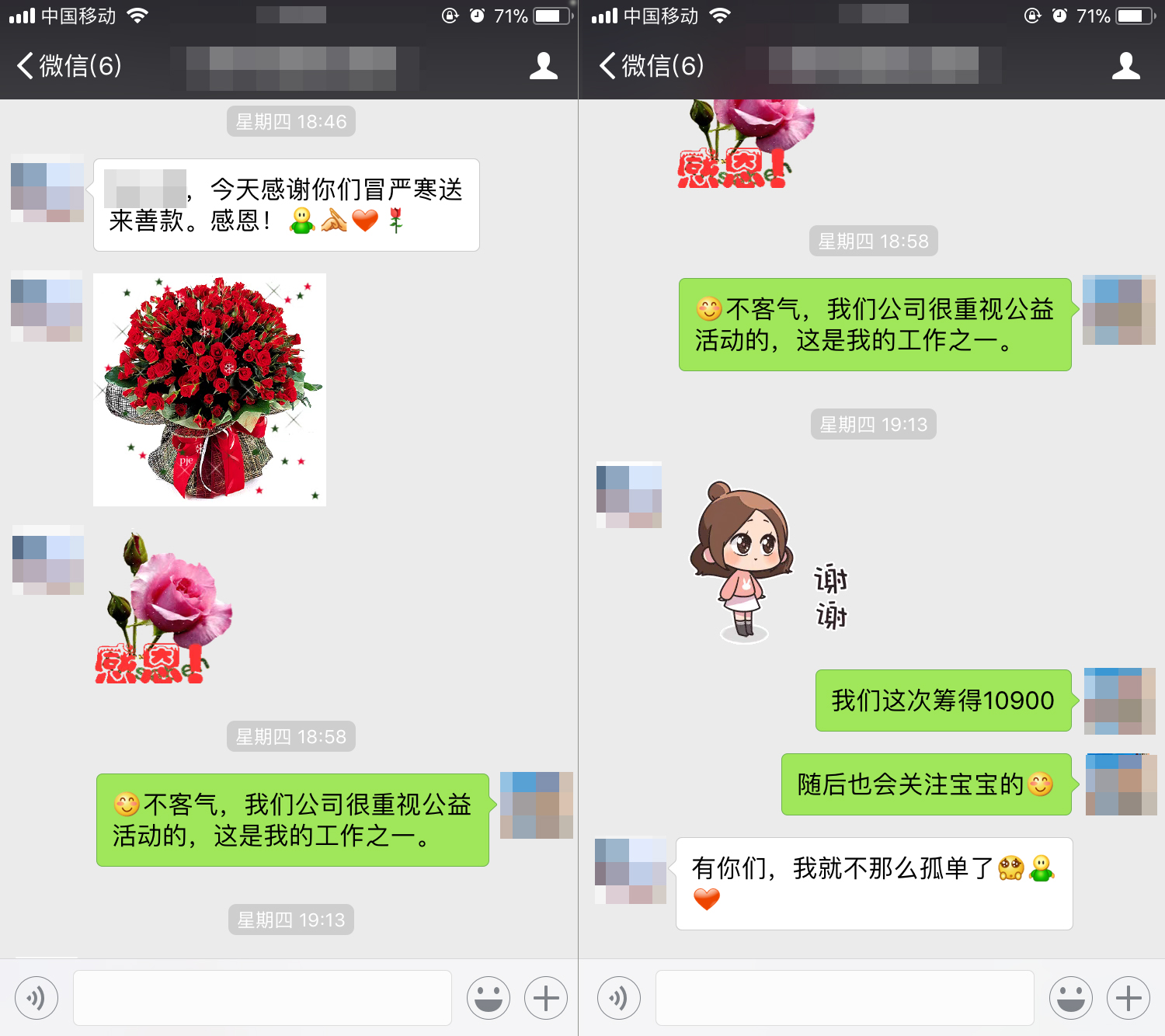 1月中旬,在活動接近尾聲之際,中安科股份派遣代表前往雙胞胎母親丁女士工作地點,將所有善款10900元親自交予她本人手中。丁女士接到善款之后非常感動,在志愿者走后再次發(fā)微信表示感激之情,“謝謝你們冒嚴寒送來善款,有了你們,我就不那么孤單了”。