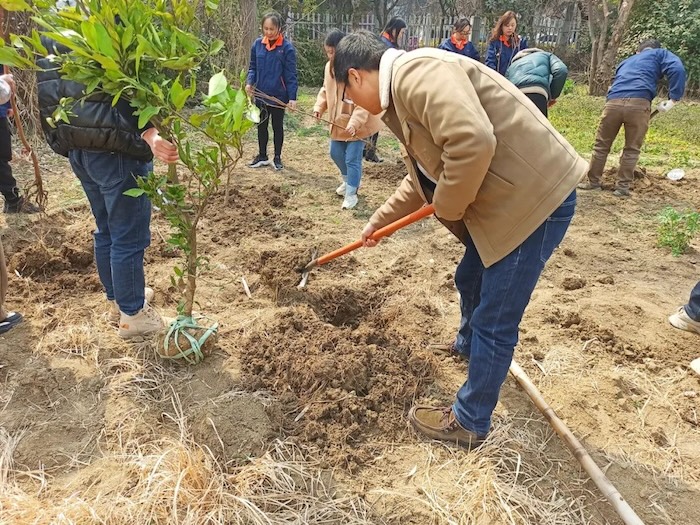 在植樹現(xiàn)場,大家干勁十足,分工協(xié)作,有的揮鍬鏟土、有的細(xì)心栽種、有的培土澆水……各個(gè)環(huán)節(jié)有條不紊,默契配合。