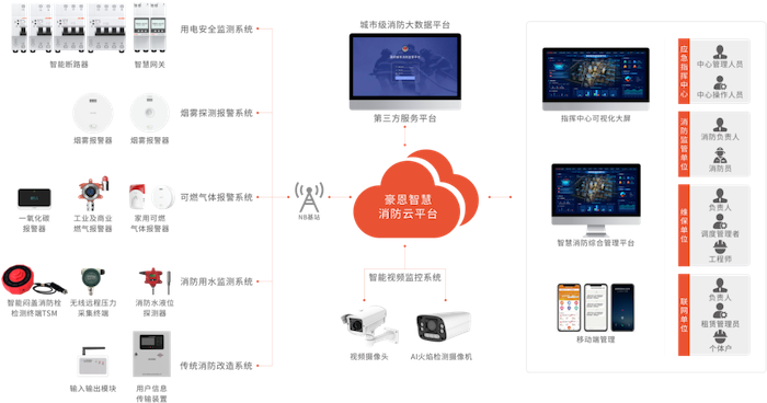 豪恩智慧消防解決方案以云平臺核心,搭載煙霧探測報警、可燃?xì)怏w報警、用電安全監(jiān)測、消防用水監(jiān)測等各個系統(tǒng),充分運用5G、大數(shù)據(jù)、云計算、人工智能等前沿技術(shù),建成由監(jiān)控服務(wù)中心、云平臺、移動應(yīng)用、智能設(shè)備等組成的智慧消防火災(zāi)防控預(yù)警一張網(wǎng),實現(xiàn)水、電、煙、氣、火等在內(nèi)的實時監(jiān)測,讓火災(zāi)隱患無處遁形,打通智慧消防最后一厘米,讓消防更智慧,讓城市更安全。