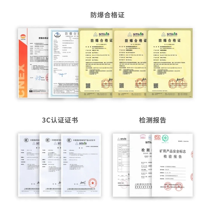 明景智慧能源防爆產(chǎn)品系列均已通過(guò)多項(xiàng)防爆檢測(cè)認(rèn)證,并獲得相應(yīng)的防爆合格證書(shū)、煤安證、本安證等。適用于含有煤塵、甲烷爆炸混合物環(huán)境場(chǎng)所,如:煤礦井下、礦山、隧道、石油、天然氣、地鐵等。