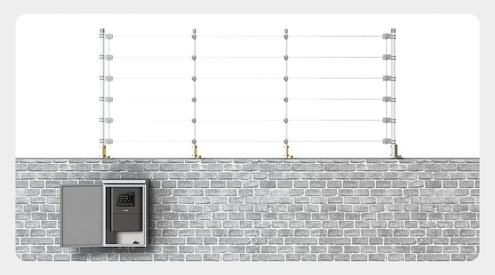 脈沖電子圍欄通常沿著圍墻安裝,區(qū)別于局限于視距和直線及平坦區(qū)域環(huán)境的紅外線、微波墻等防范系統(tǒng)。電子圍欄全天候工作,穩(wěn)定可靠,可以依據(jù)地形任意架設(shè),不受地形高低和邊界曲折形狀的限制,也不受氣候、植物、小動(dòng)物等因素影響。